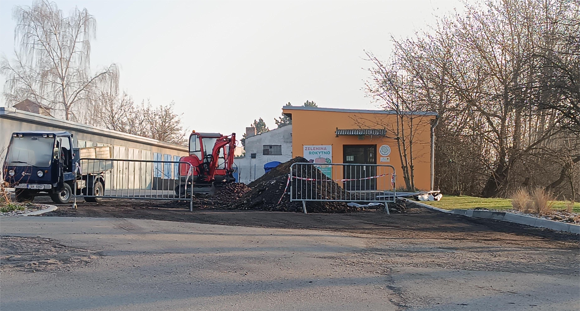 Před prodejnou probíhají výkopové práce. Přístup je možný od benzínové stanice Fuel, kolem mostní váhy vpravo.